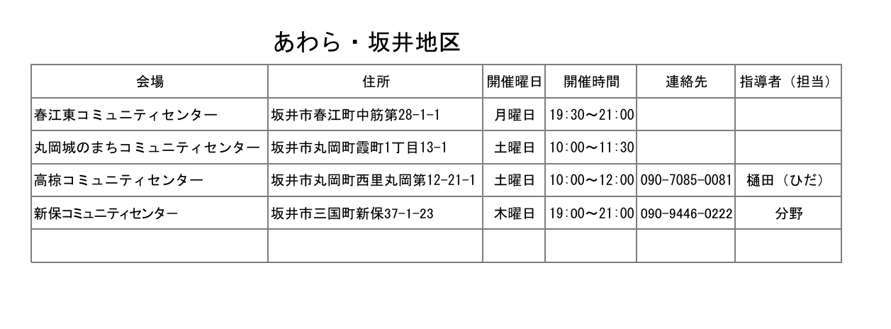 リストに連絡先が明記されている団体は直接問い合わせください。連絡先が明記されていない団体については、福井県武術太極拳連盟 ☎0776-22-5625 まで問い合わせ願います。