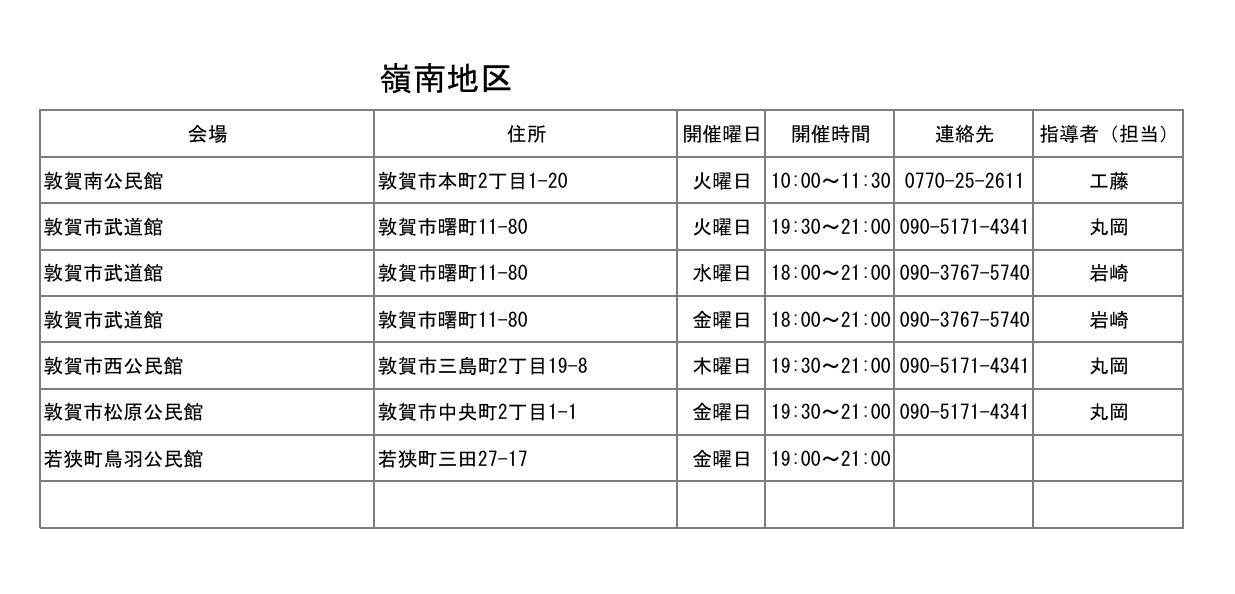 リストに連絡先が明記されている団体は直接問い合わせください。連絡先が明記されていない団体については、福井県武術太極拳連盟 ☎0776-22-5625 まで問い合わせ願います。