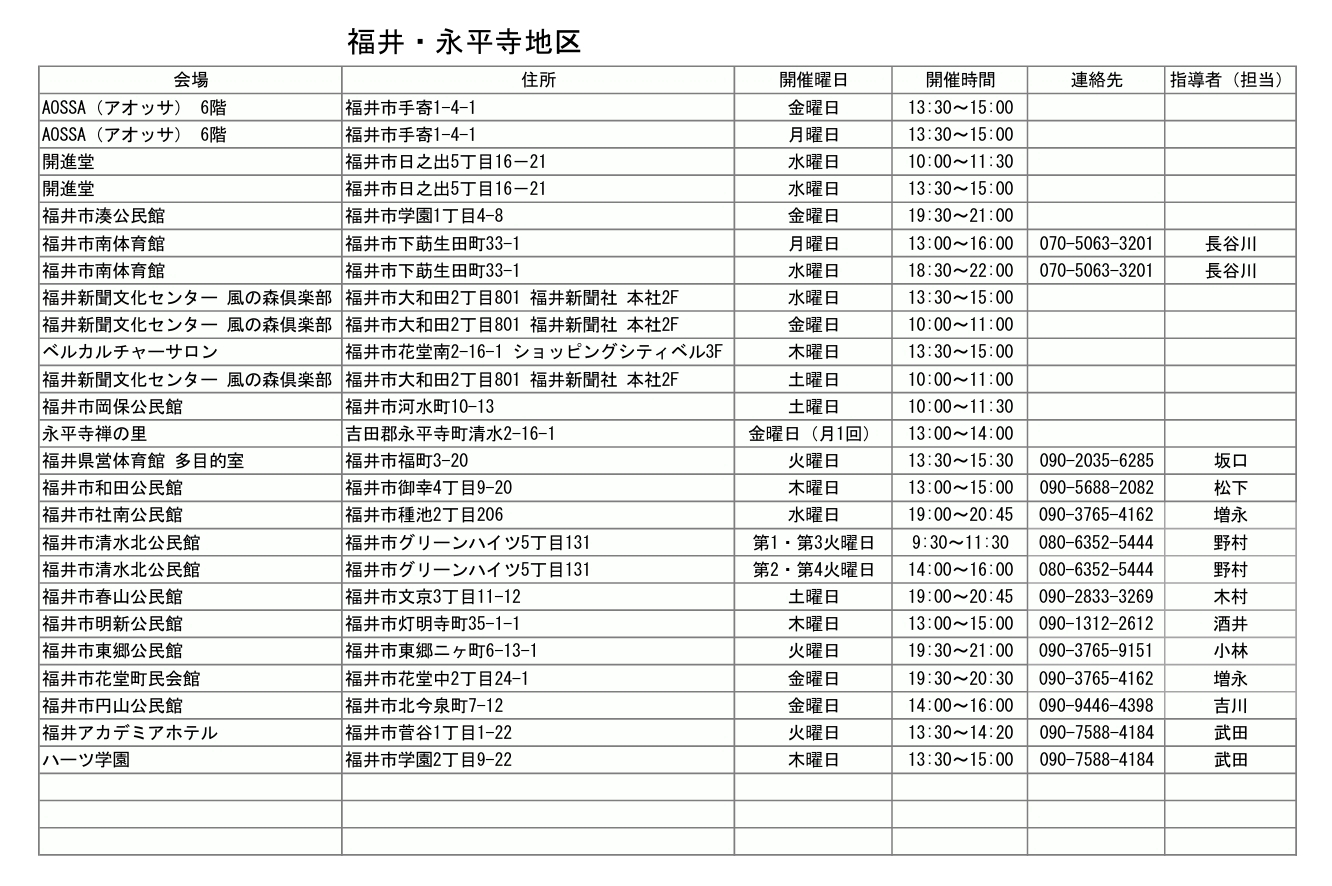 リストに連絡先が明記されている団体は直接問い合わせください。連絡先が明記されていない団体については、福井県武術太極拳連盟 ☎0776-22-5625 まで問い合わせ願います。